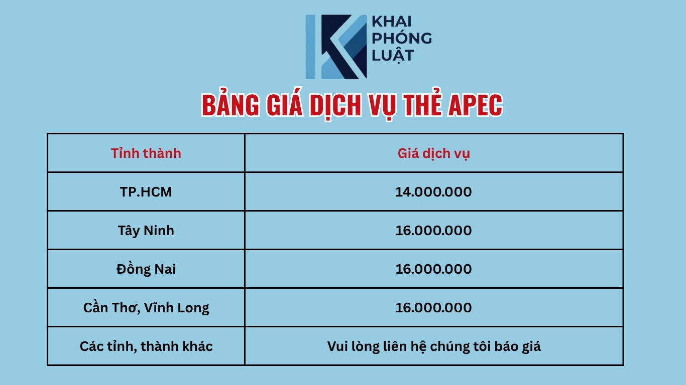 Khai Phóng Luật cung cấp dịch vụ xin cấp thẻ APEC trọn gói với giá chỉ từ 14.000.000, chuyên xử lý hồ sơ khó và cam kết không phát sinh chi phí dịch vụ cho khách hàng. Liên hệ chúng tôi để biết thêm chi tiết.
